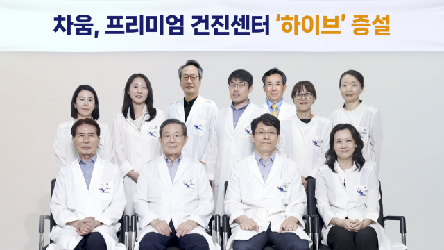 차움 하이브 검진센터와 검진센터 교수진. (앞 왼쪽부터) 내분비내과 김진우 교수, 신경외과 최중언 교수, 차충근 진료부원장, 내분비내과 황세나 교수 (뒤 왼쪽부터) 디톡스슬리밍센터 오효주 · 서은경 교수, 김재화 원장, 파워에이징클리닉 양지헌 교수, 소화기내과 한광협 교수, 영상의학과 김인화 · 위성아 교수