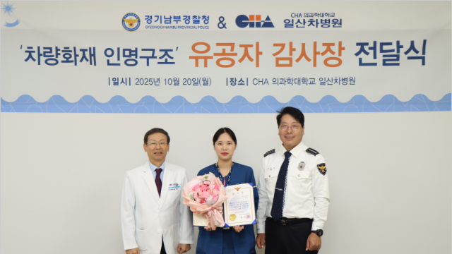 (왼쪽부터) 유공자 감사장 전달식에 참석한 일산차병원 송재만 원장, 박채원 간호사, 경기남부경찰청 위동섭 교통과장(총경)